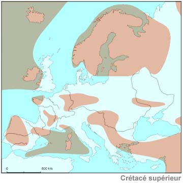 Le crétacé supérieur constitue le dernier système du Mésozoïque. Il débute il y a 100 millions d'années par une forte élévation du niveau des mers, pour s'achever il y a 65 Ma par une forte régression de ce niveau (d'environ 2 à 300 m). | |
